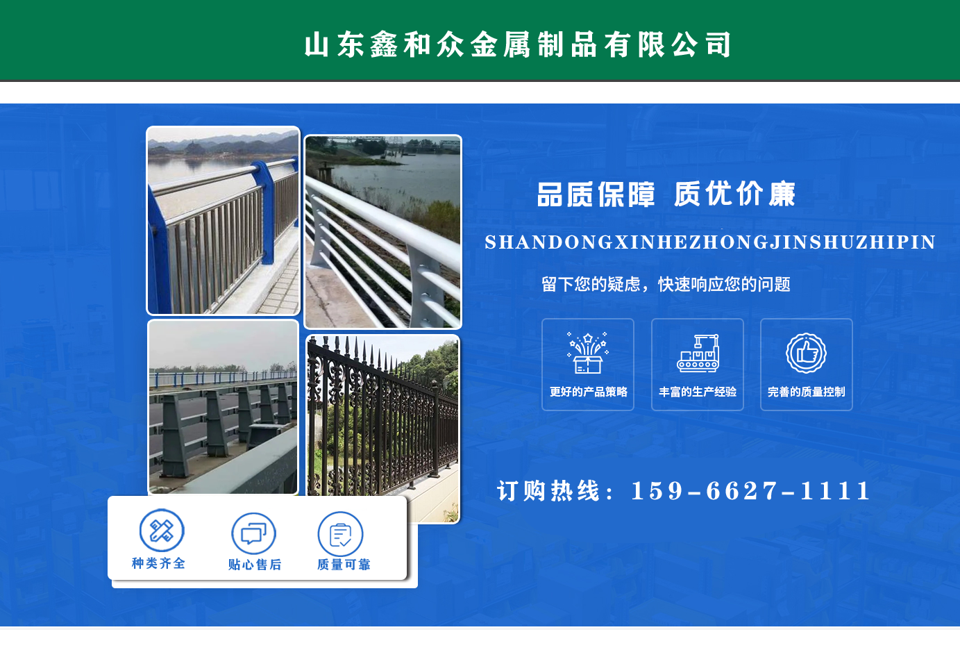 山東鑫和眾金屬制品有限公司主要產(chǎn)品有防撞護欄,橋梁護欄,道路護欄,河道護欄,不銹鋼護欄等護欄。提供設(shè)計方案,一站式定制,包您滿意價格優(yōu)惠,歡迎來電咨詢! 公司常年從事銷售護欄防撞護欄,橋梁護欄,道路護欄,河道護欄,不銹鋼護欄,橋梁鋼護欄,河道燈光護欄等。產(chǎn)品廣泛應(yīng)用于橋梁、河道、旅游景區(qū)、道路、公路、公園、小區(qū)、景觀、道路防撞等領(lǐng)域?! 」井a(chǎn)品均采用優(yōu)質(zhì)不銹鋼材料,符合相關(guān)標準。各種型號不銹鋼復(fù)合管及護欄,質(zhì)量嚴格把控。產(chǎn)品強度高、耐腐蝕、焊接牢固、抗沖擊、性能好,防撞護欄結(jié)構(gòu)簡單、美觀實用大方。 歡迎前來訂購!...